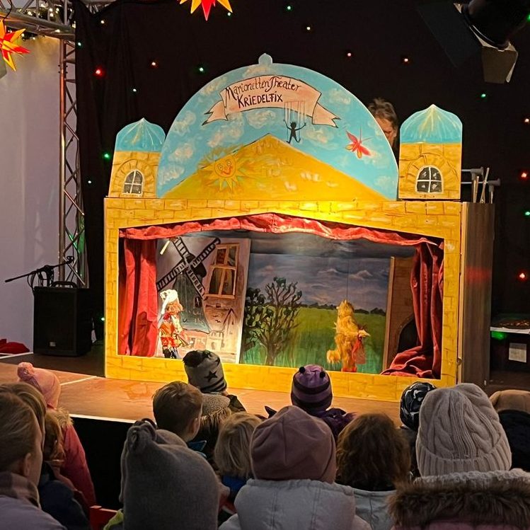 Der Veranstalter " Schweriner Weihnachtsmarkt GmbH" hatte Spaß mit abwechselnden Vorstellungen des " Marionettentheater Kriedelfix ". Es wurden " der gestiefelte Kater " und die " Bremer Stadtmusikanten " gezeigt, beide nach den Gebrüdern Grimm, interpretiert von Martina Kriedel