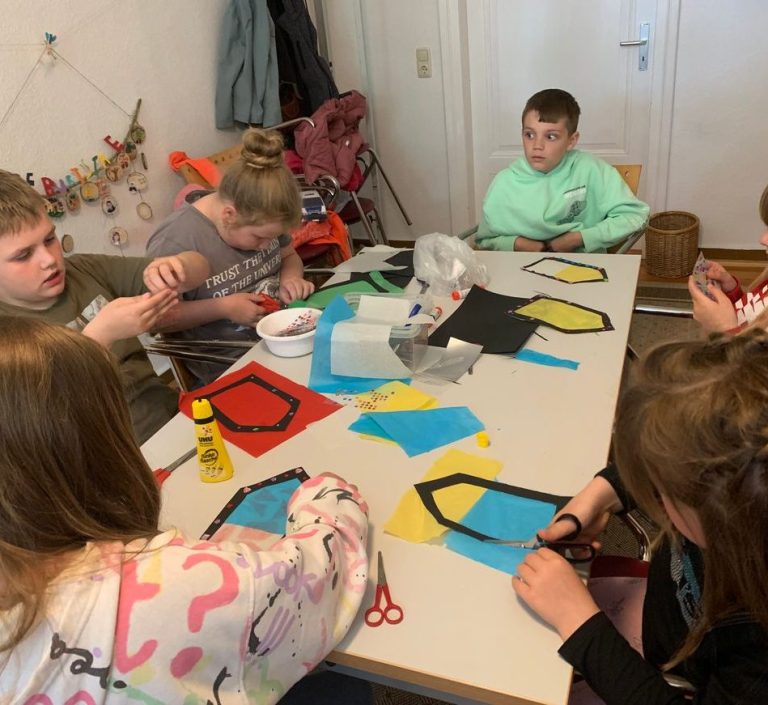 Als ausgebildete Ezieherin und freischaffende Künstlerin gestalte ich mit Ihren Kindern kreative Ideen ( hier : Kirchenfenstergestaltung für unsere Modellkirche zum Jubiläum des Ortes )